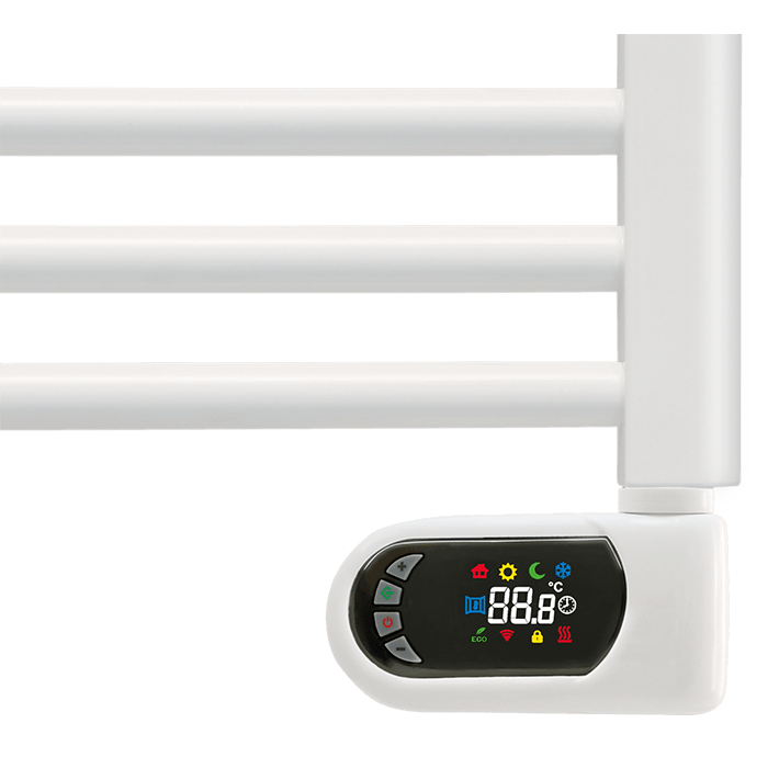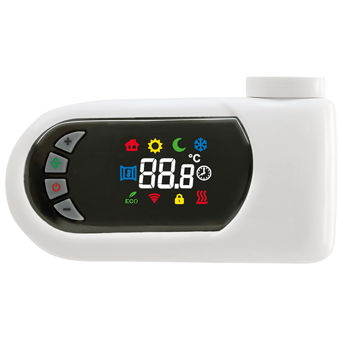 Digital electronic thermostat for room temperature control. It can be assembled with different heating elements, which can be easily obtained and replaced from our major European manufacturers. There is the useful open window detection function to reduce electricity waste. It is equipped with IR receiver. The programmable thermostat can be set using the Galaxy remote control with which you can perform weekly programming. It features a pleasant visualization on the large color display, of the main parameters represented with numbers and symbols. When the thermostat is in stand-by, the display is switched off and has an elegant neutral reflection with a pleasant aesthetic effect.